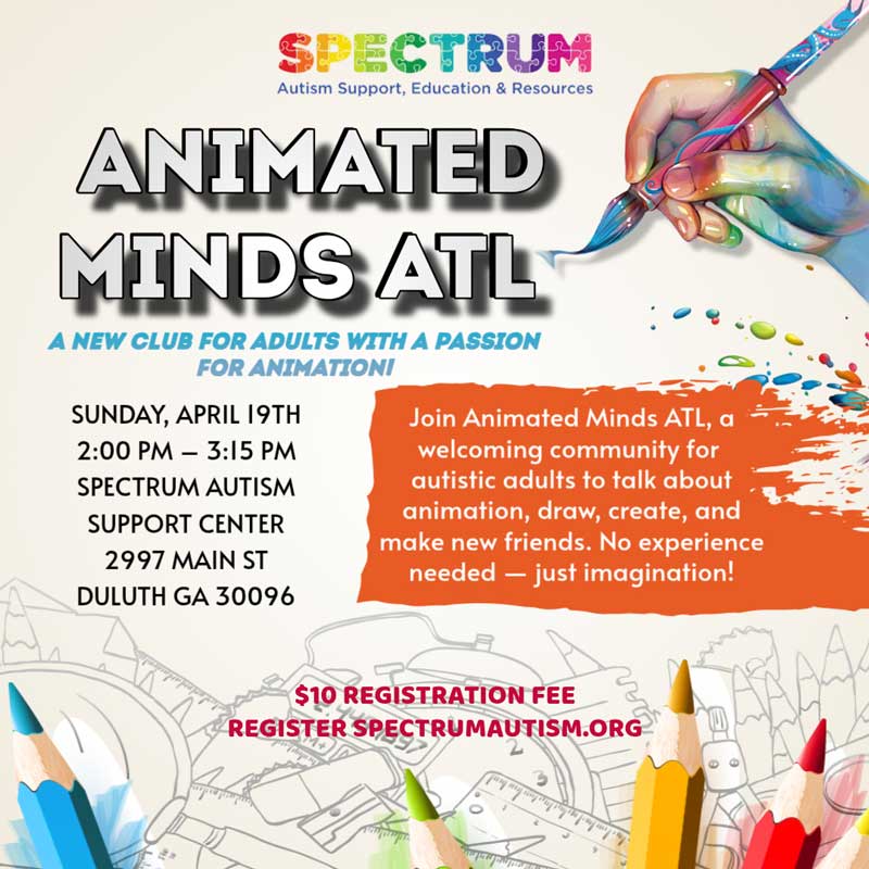 Spectrum Support Center 2997 Main Street, Duluth, GA, United StatesAnimation Club - March 15 Participant Name* First Last Email* Participants Age*Participants Phone Number*Emergency Contact* First Last Emergency Contact Phone*Animation Club Registration - March 15, 2026 Price: By registering for…