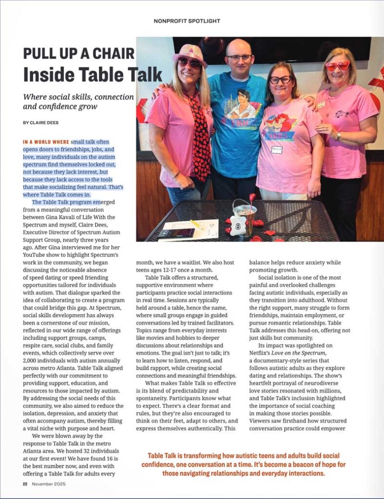 We’re thrilled to share that Uniquely You Metro Atlanta magazine has spotlighted Spectrum Autism Support Group’s Table Talk program in its November issue. The article, “Pull Up a Chair: Inside…